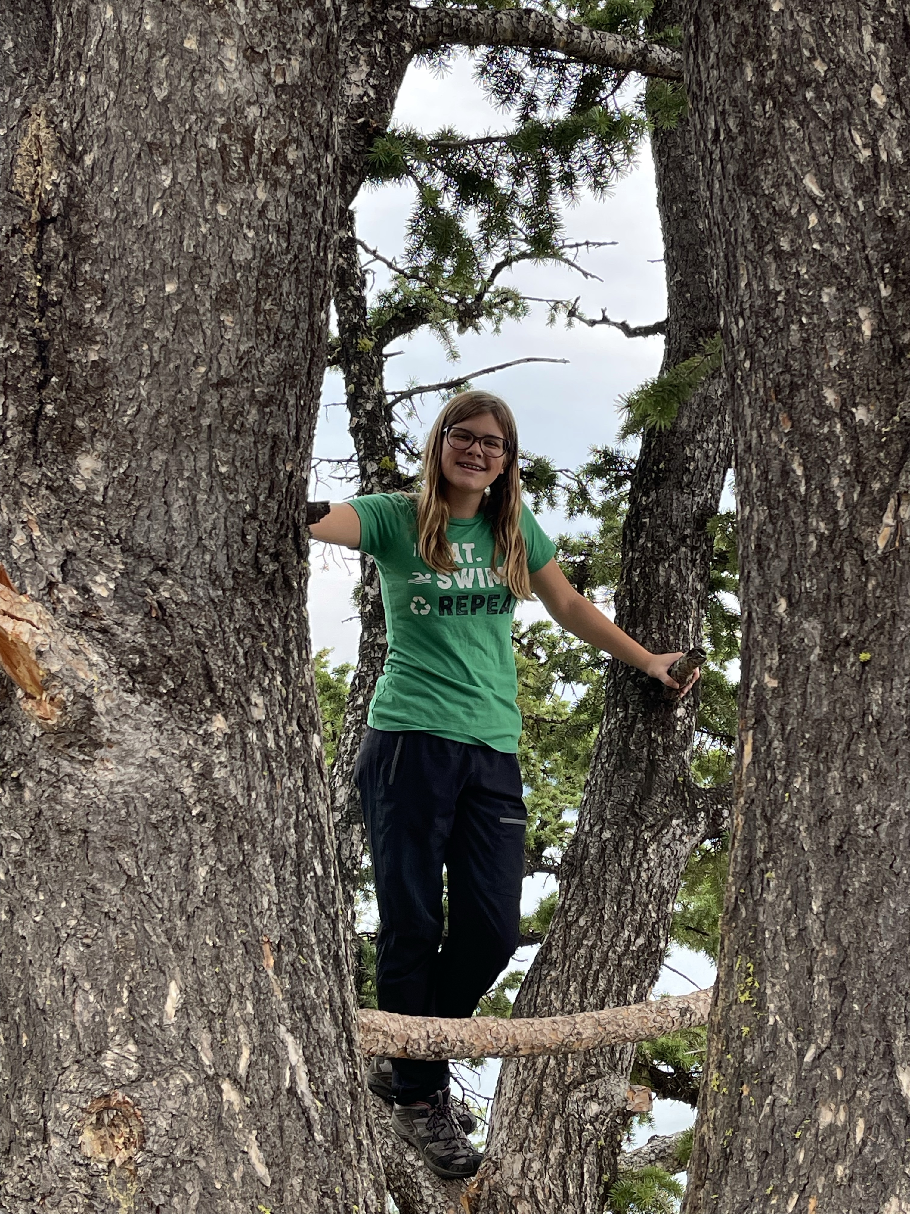 In keeping with our laid back day, we opted to take a boat across Jenny Lake to explore a bit more. On most days, the wait time to get on the boat is 30-45 minutes, but we lucked out with only a 15 minute wait. Also, we asked about a military discount and, much to our surprise, because we are an active duty family, it was free – super appreciative of the $60 savings! 🇺🇸 As soon as we got off the boat, the girls found a rock to climb. Sweet Livi girl wore crocs, because… Livi. So Peyton was able to scale the rock with ease in her hiking boots. But Livi was certainly struggling. When Peyton got to the top, she realized there were naturally occurring stair steps on the other side. After a moment of thoughtful introspection, she made the good choice to tell her sister about the short cut instead of watching her struggle and get frustrated!