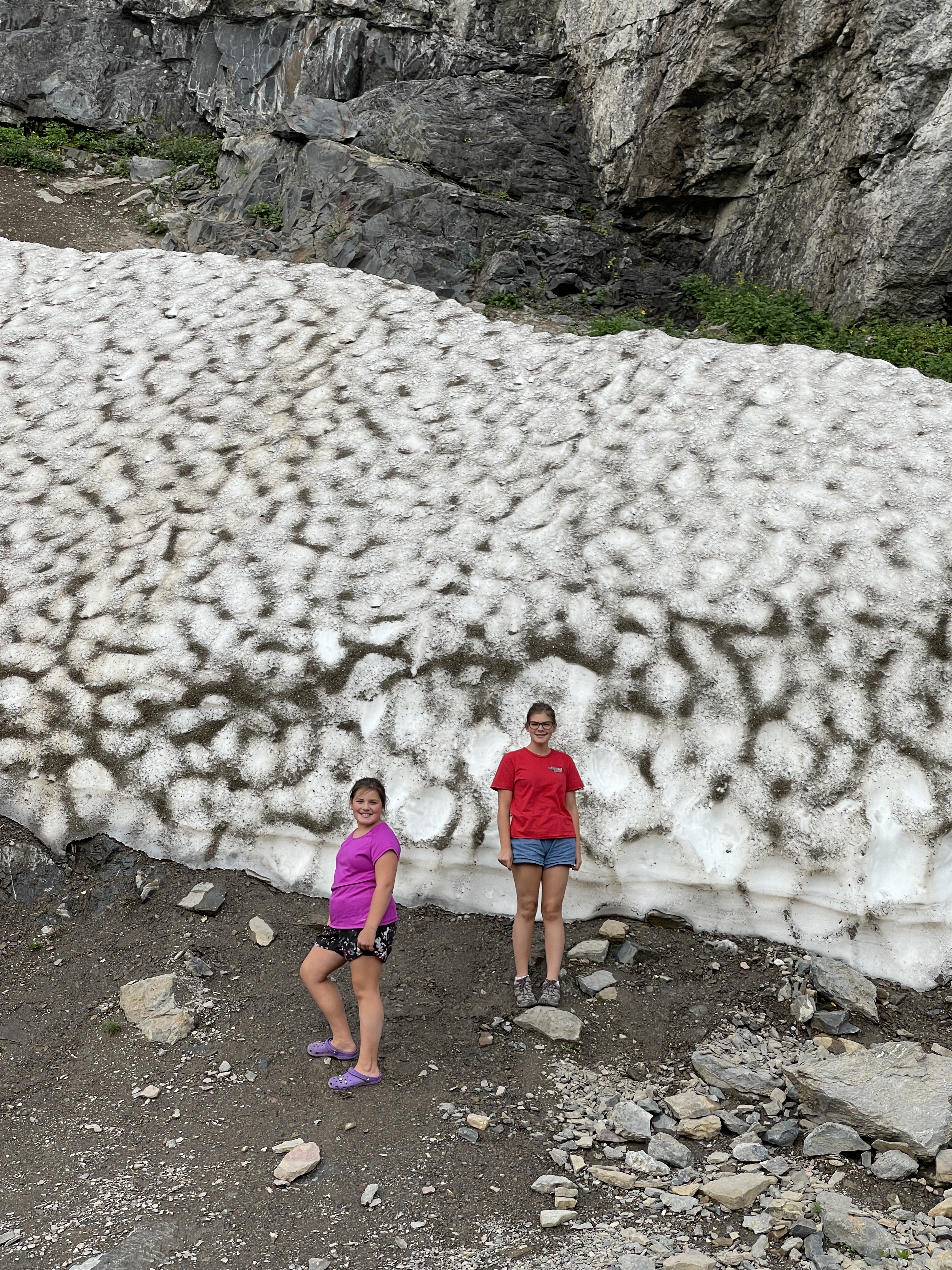 Conveniently, the Going to the Sun Road brought us back to the entrance/exit of Glacier National Park which was a mere five minutes from our campsite! There are no words to adequately describe the foliage, terrain, animals and views we encountered on the drive. I am going to post some of our favorite photos, but truly none of them capture the beauty our eyes were blessed enough to experience first hand. The drive took about 1 1/2 hours and around every hairpin turn we were continuously more and more impressed with what we were seeing. The girls were even able to touch a glacier – in August!!