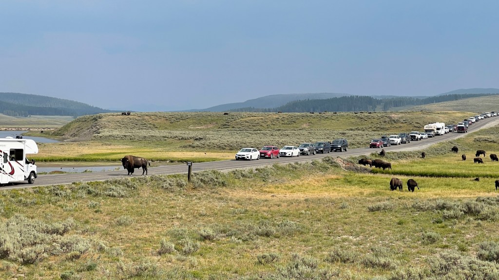 After lunch, we were driving back towards our campground to see what we could see. We stumbled into a traffic jam in Hayden Valley… Wyoming-style. 🦬 It almost seemed as if the bison had a well cultivated plan to annoy the dumb humans invading their space. When one bison would clear the road, another would slowly saunter onto the road to assume the role. And let me tell you, these bison could not possibly care any less about being in the way. It was awesome!