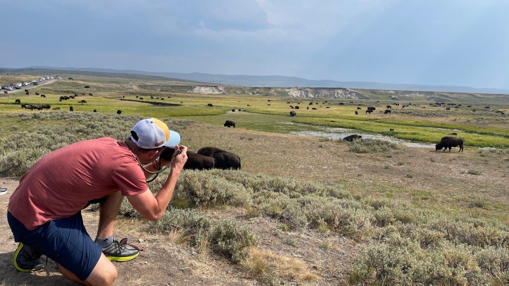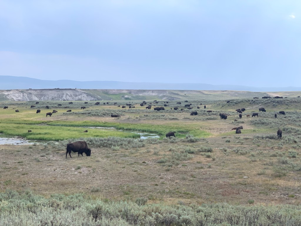 Back to the good stuff, which basically started at 7am and did not end until bedtime. After leaving Bridge Bay and driving along the foggy roads of Yellowstone, not even 5 minutes outside the campground, we encountered our first bison!! 🦬