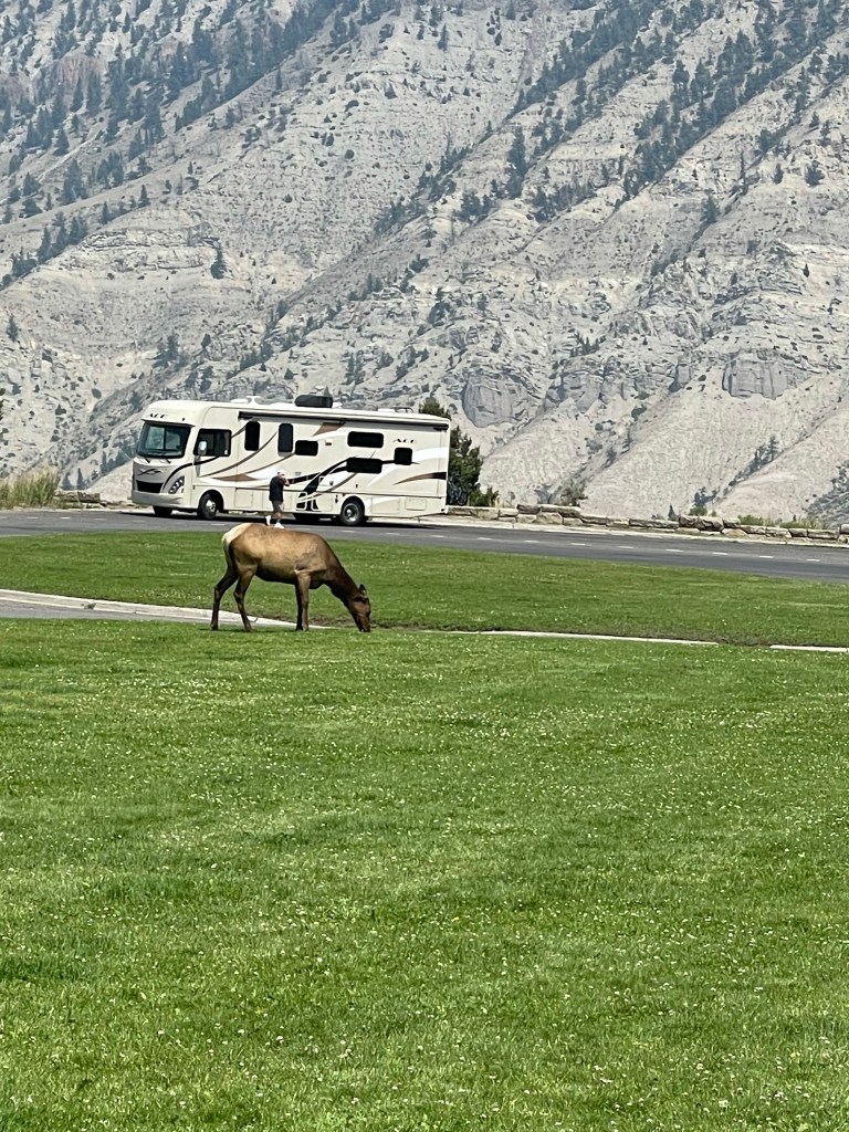 The original plan was to visit Mammoth Hot Springs but apparently everyone else in the park also had that plan. We quickly pivoted our plan when we spotted a perfect pull off where we could set up Harvey (the RV) and have a nice picnic lunch. The breeze was perfect and there were no other humans around to annoy us. Check out the views below… they definitely did not suck!